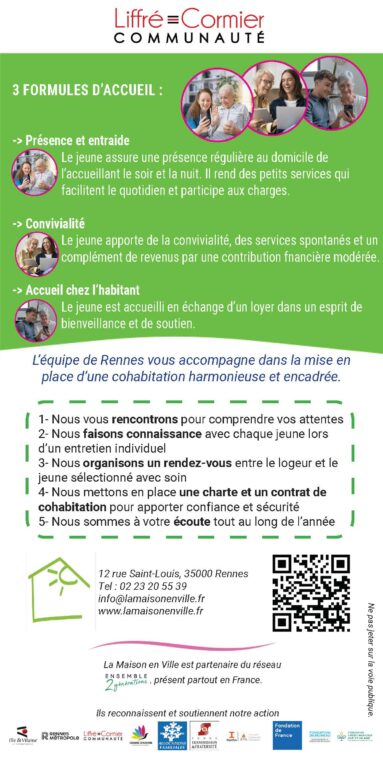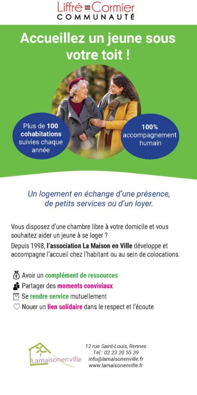 Liffré-Cormier développe la cohabitation intergénérationnelle sur le territoire en partenariat avec La Maison en Ville qui accompagne les binômes, dans l’optique de proposer l’accès au logement abordable aux jeunes actifs et de limiter l’isolement des anciens et la sous occupation éventuelle de leur logement.